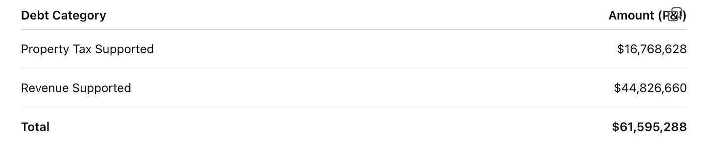 Debt obligations (principal and interest): $61,595,288 total, split between $16,768,628 property-tax-supported and $44,826,660 revenue-supported.