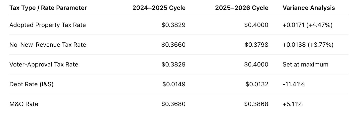 Tax rate composition: M&O rose to $0.3868, while the debt rate fell to $0.0132 (down from $0.0149).