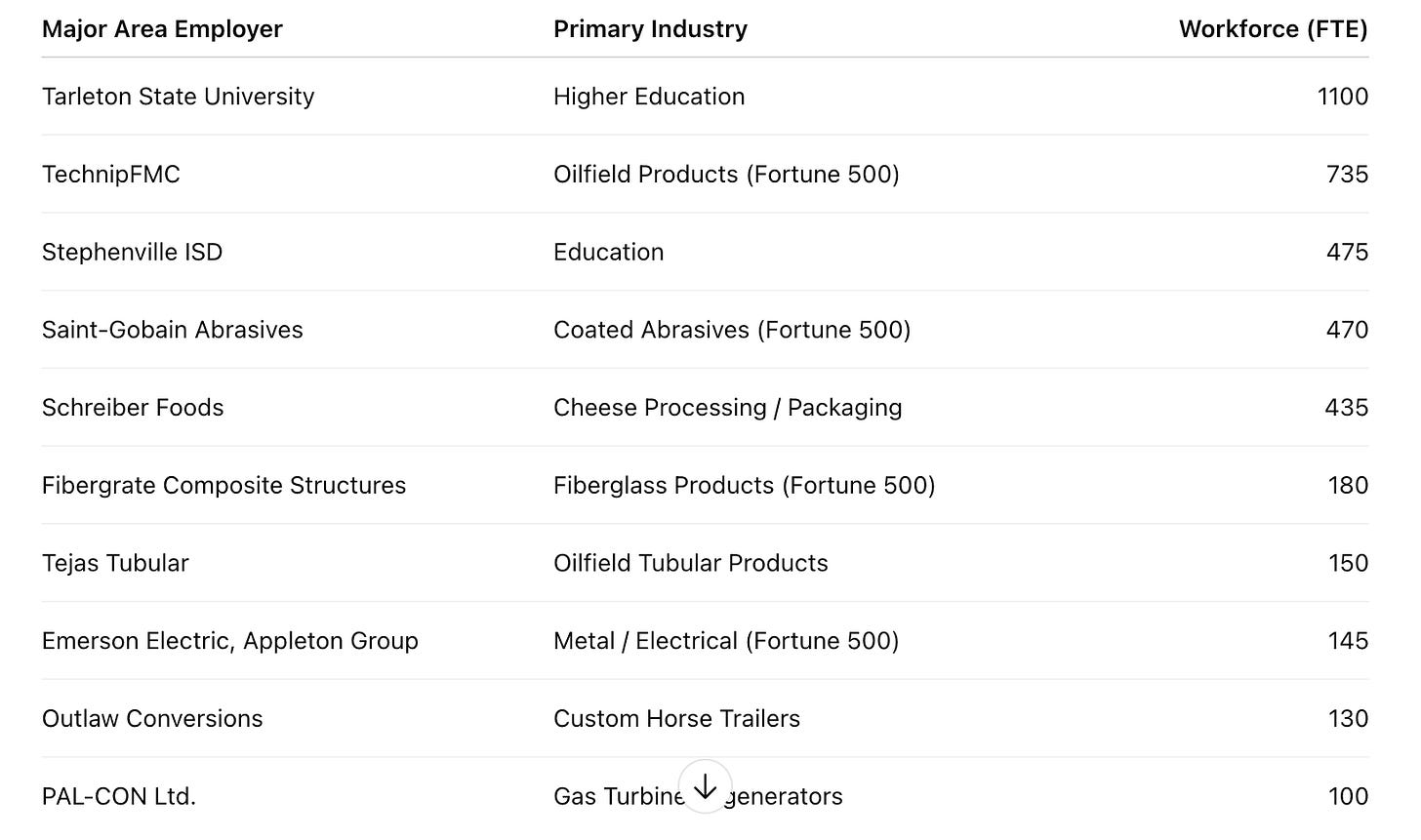 Largest local employer: Tarleton listed at 1,100 FTE, plus 500+ part-time student workers per the Chamber profile. Manufacturing depth: Multiple major plants show up with meaningful headcounts, including TechnipFMC (735) and Saint-Gobain (470).